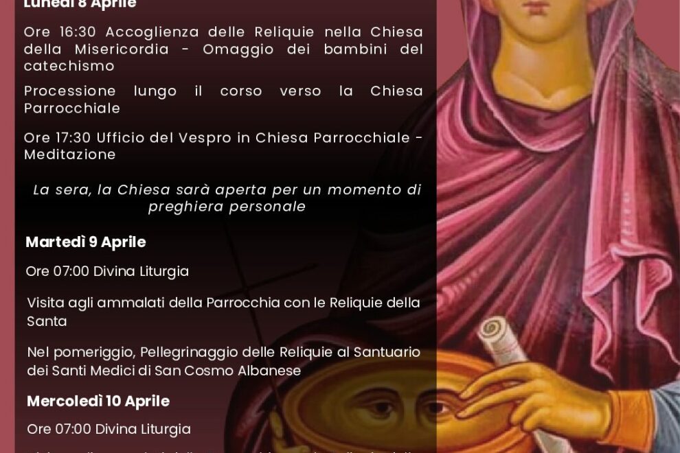 Le sacre Reliquie di Santa Lucia saranno in visita ad Acquaformosa dal giorno 8 al giorno 11 Aprile 2024. Il Programma di seguito