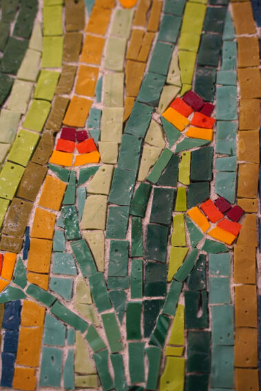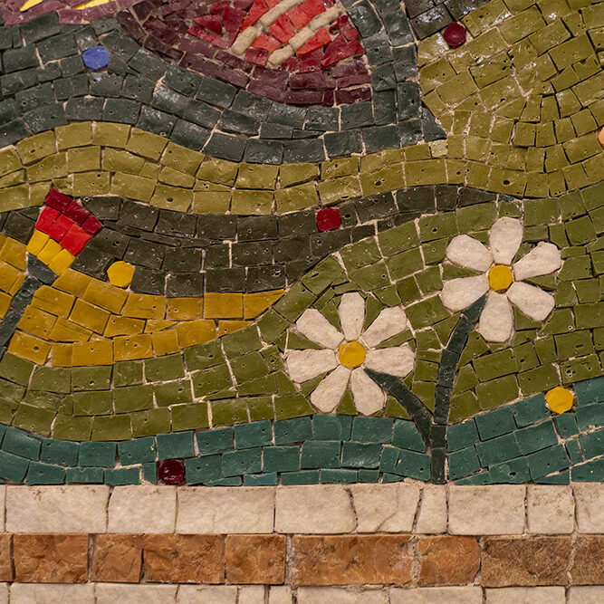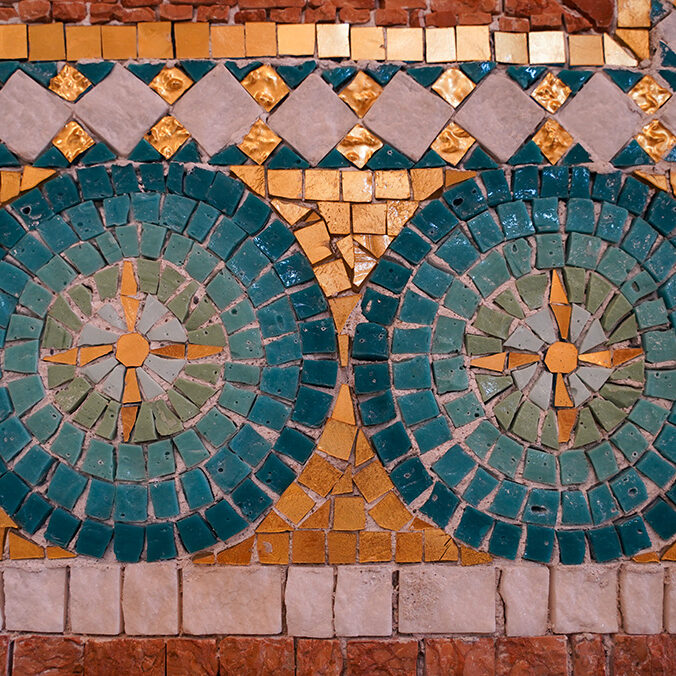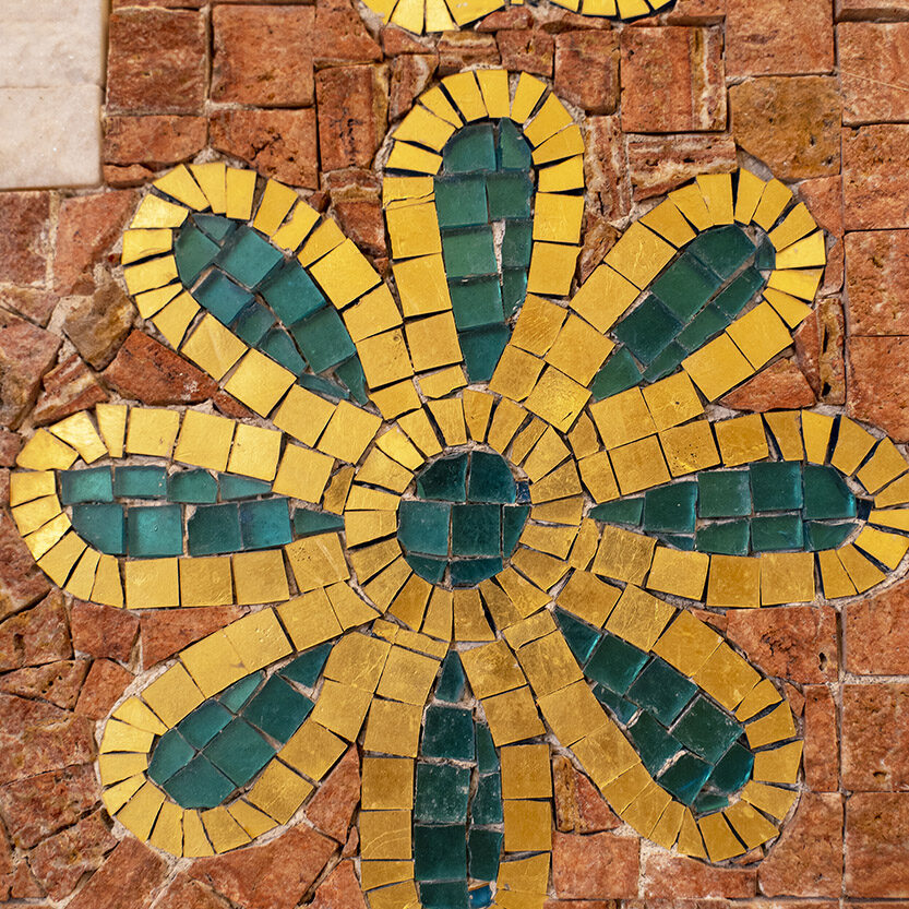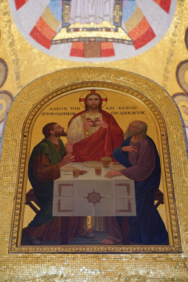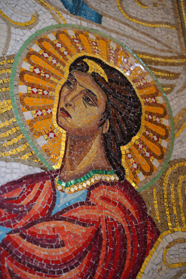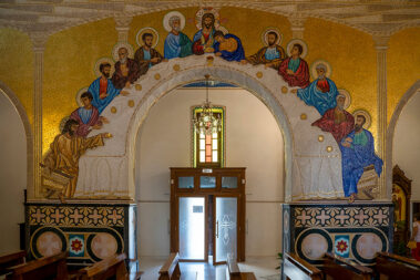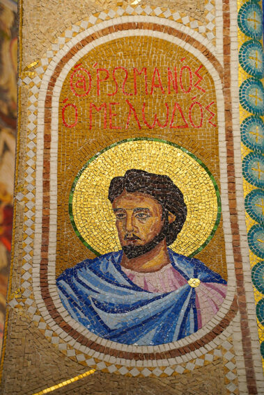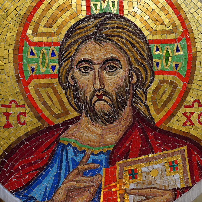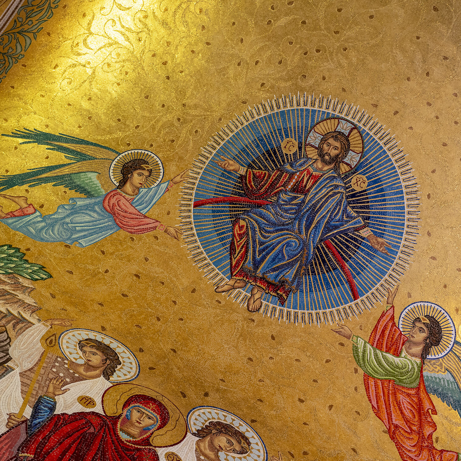 Nel 1990, prima di iniziare i lavori, egli sottopone alla commissione eparchiale per l’arte sacra un suo progetto relativo al rivestimento della volta dell’abside. Il progetto riceve l’approvazione. Così egli inizia a comporre quei mosaici ancora oggi non del tutto completati. Il piano iconografico già realizzato presenta all’esterno, nella lunetta sovrastante la porta della chiesa, la Deisis. All’interno della chiesa, nella volta del vima è raffigurata l’Etimasia affiancata dalle figure dei Dodici Apostoli sedute dentro cornici monolobate. Sulla parete absidale, dall’alto verso il basso, si trovano: la Platytera, Cristo che distribuisce L’Eucaristia agli Apostoli sotto le due specie del pane e del vino e più in basso vari Padri della Chiesa – S. Mimasio, S. Giovanni Crisostomo, S. Basilio, S. Gregorio Teologo, S. Cirillo d’Alessandria e S. Nicola di Mira.