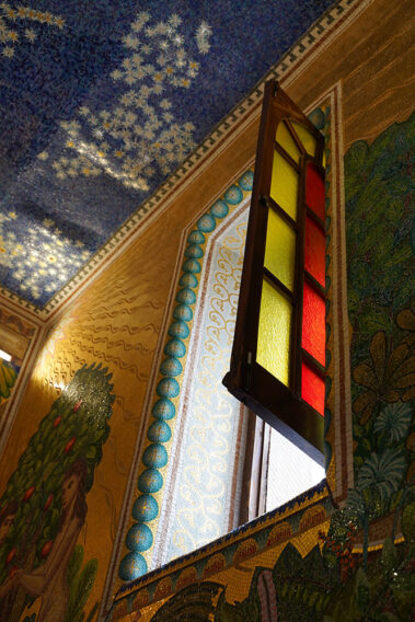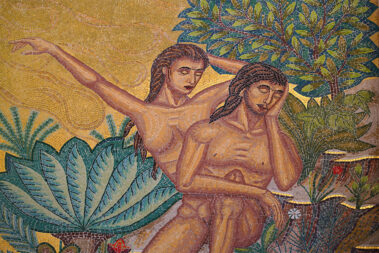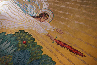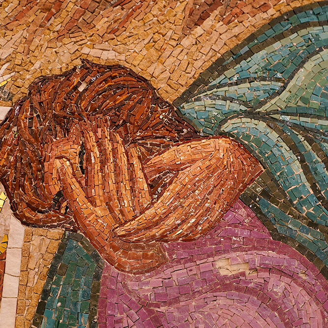 L’iconostasi di questa cappella è stata realizzata in marmo e su di essa è già stato eseguito, all’interno del tondo, a sinistra della porta, l’immagine musiva del Cristo. Sulla facciata dell’arcata entro cui si apre L’iconostasi è stato rappresentato il Padre Eterno nei primi momenti della Creazione, nell’atto cioè di separare la luce dalle tenebre. Egli è affiancato da due angeli a forma di fiamme secondo una visione tratta dal testo biblico; più in alto ai lati del suo volto appaiono i primi due astri creati, mentre dalla mandorla divina entro cui Dio è raffigurato si irradiano lingue di luce che hanno il sopravvento sull’oscurità. Sul soffitto della navata è stata raffigurata la creazione del firmamento. Mettendosi con le spalle al battistero si può osservare sulla parete destra sovrastante la prima arcata la Separazione delle terre dalle acque, di seguito la Creazione della vegetazione sulla terraferma e dei pesci nelle acque; sull’arcata successiva la creazione degli animali sulla terraferma e la creazione di Adamo. A partire nuovamente dal battistero, ma sulla parete sinistra si può ammirare la creazione di Eva, il Peccato originale, la Consapevolezza del peccato e la Cacciata di Adamo ed Eva dal paradiso. Sulla parete di fondo Biagio Capparelli intende raffigurare il perdono come anello di congiunzione teologica, ma anche iconografica tra la creazione dell’uomo e la sua cacciata dal paradiso.