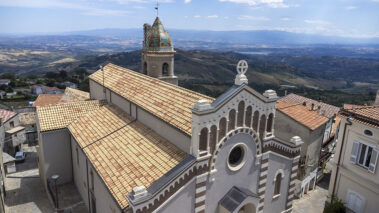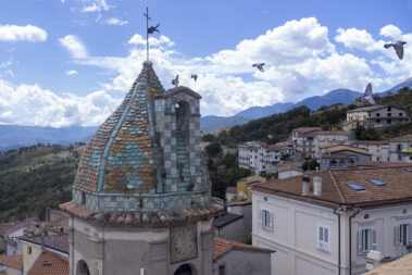 Il campanile a torre ottagonale culmina con la cupola coperta con elementi decorativi di manufatti in argilla dipinti con smalti policromi.