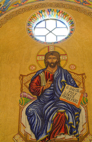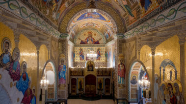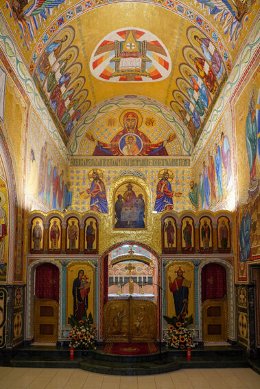 Sul lato orientale della navata centrale vi è una parte sopraelevata, è il solea, che è il luogo della comunione dei fedeli, oltre il solea, divisa dall’iconostasi, che letteralmente significa luogo delle icone, su un piano ancora superiore si trova l’Altare (da alta ara) che significa alto luogo, dove si accede attraverso la Porta Regale.