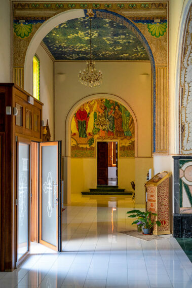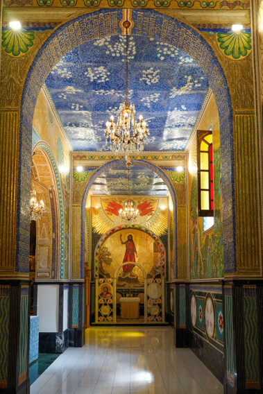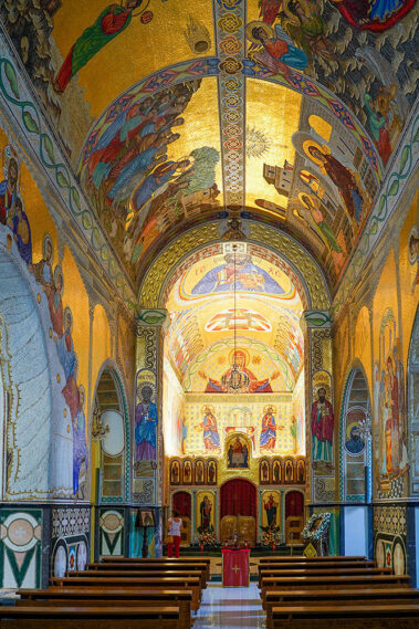 La parete dell’iconostasi è decorata sulla parte anteriore con motivi floreali, mentre nella parte posteriore sono stati rappresentanti l’Arcangelo Michele e l’Arcangelo Gabriele a destra e a sinistra della porta centrale al di sopra della quale è raffigurato un exapteriga. Sulla parete a destra del solea è rappresentata la Trasfigurazione di Cristo, mentre di fronte, sopra l’arcata che si apre nella parete sinistra campeggia il Mandylion, nel sottarco troviamo S. Biagio e S. Vincenzo. Sulla volta del solèa è esposto il Cristo Pantokrator affiancato dai simboli dei Quattro Evangelisti. L’arco trionfale è tutto decorato con motivi geometrici. Proseguendo verso la navata centrale in alto sulla volta sono state raffigurate sei feste del Calendario Liturgico bizantino: l’Annunciazione, il Natale di Gesù, il Battesimo di Cristo, l’ingresso di Gesù a Gerusalemme, la Crocifissione e la Resurrezione di Cristo. Nei sottarchi che collegano la navata centrale con la navata sinistra trovano posto vari santi. Sulla parete sovrastante l’ingresso principale campeggia Cristo in trono affiancato da Angeli. Infine, sulla parete sinistra della navata, nello spazio degli intercolunni, l’artista ha eseguito, utilizzando sapienti soluzioni formali, l’Ultima Cena, mentre sulla parete destra trova posto la Presentazione al Tempio di Gesù. Le ante delle porte dell’iconostasi sono state realizzate, ad opera dello stesso artista, in bronzo galvanizzate in oro e sulle ante della porta centrarle è stata rappresentata l’Annunciazione; il ciborio retto da quattro colonne in marmo di Carrara bianco è in rame galvanizzato in oro. Nel battistero dedicato a S. Giovanni Battista, patrono della parrocchia, vi è la rappresentazione del Battesimo delle Folle a sinistra, il Ballo di Salomè e la Decolazzione a destra, S. Giovanni Battista al centro.