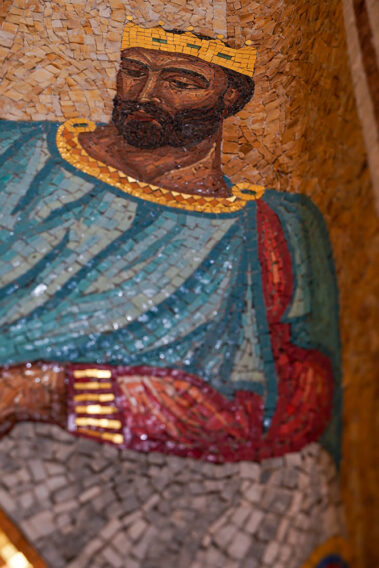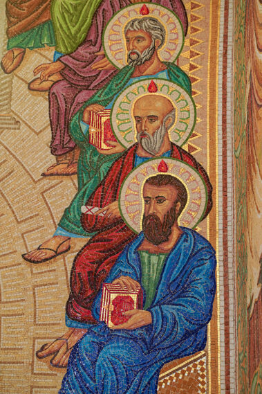 La chiesa di San Giovanni Battista, ad Acquaformosa, è l’unica dell’eparchia che sia rivestita di mosaici realizzati da un unico artista su una superficie così estesa. Il parroco, papàs Vincenzo Matrangolo, spinto dal desiderio di arricchire la sua chiesa con immagini che predicassero la parola del Vangelo, dopo aver preso contatti per una possibile commissione con una pittrice greca decide, su suggerimento di papàs Pietro Tamburi, di contattare uno dei suoi stessi parrocchiani: Biagio Capparelli, che aveva collaborato alla realizzazione musiva della Theotôkos in trono nella cattedrale di Lungro. Biagio Capparelli che aveva terminato gli studi presso l’Accademia delle Belle Arti di Roma accetta nel 1988 di assumere questo incarico e prima di mettersi all’opera si reca a studiare sul posto le maggiori realizzazioni musive presenti in Italia (Monreale, Cefalù, Ravenna).