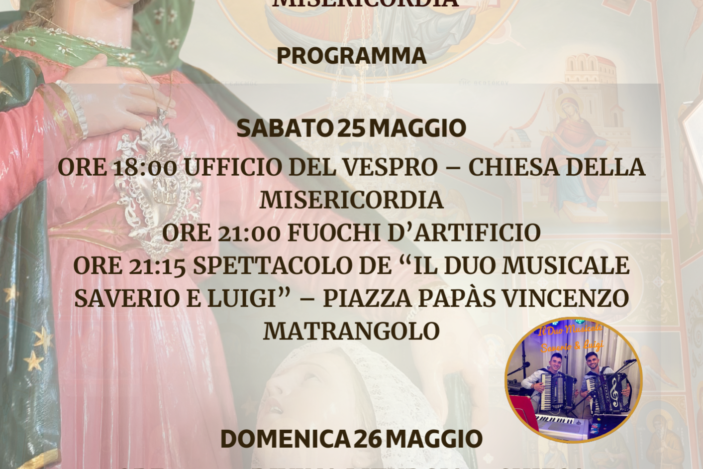Mag222024 26 MAGGIO 2024 DOMENICA DI TUTTI I SANTI FESTA DELLA MADONNA DELLA MISERICORDIA PROGRAMMA DELLE CELEBRAZIONI PER SABATO 25 E DOMENICA 26 MAGGIO 2024 Chiesa Parrocchiale San Giovanni Battista Acquaformosa (Cs) Naviga tra i postPrecedentePost precedente:DOMENICA DI PENTECOSTESuccessivoProssimo post:CERIMONIA DI CONSACRAZIONE DELL’ALTARE CHIESA MADONNA DELLA MISERICORDIAMore articlesVEGLIA MISSIONARIA DIOCESANA 23 MARZO 202511 Marzo 2025JAVA E PRIGATORËVET 17-22 FEBBRIO 202514 Febbraio 2025GIUBILEO DELLE CHIESE ORIENTALI 12-14 MAGGIO 202514 Febbraio 2025GITA AL LUNAPARK DI RENDE 10 NOVEMBRE 202430 Ottobre 2024SAGRA DELLA CASTAGNA E DEL MANGIARE ANTICO ACQUAFORMOSA 31 OTTORE E 1 NOVEMBRE 2024 MERCATINO DELL’ORATORIO PARROCCHIALE30 Ottobre 2024SAGRA DELLA CASTAGNA E DEL MANGIARE ANTICO ACQUAFORMOSA 31 OTTORE E 1 NOVEMBRE 202430 Ottobre 2024