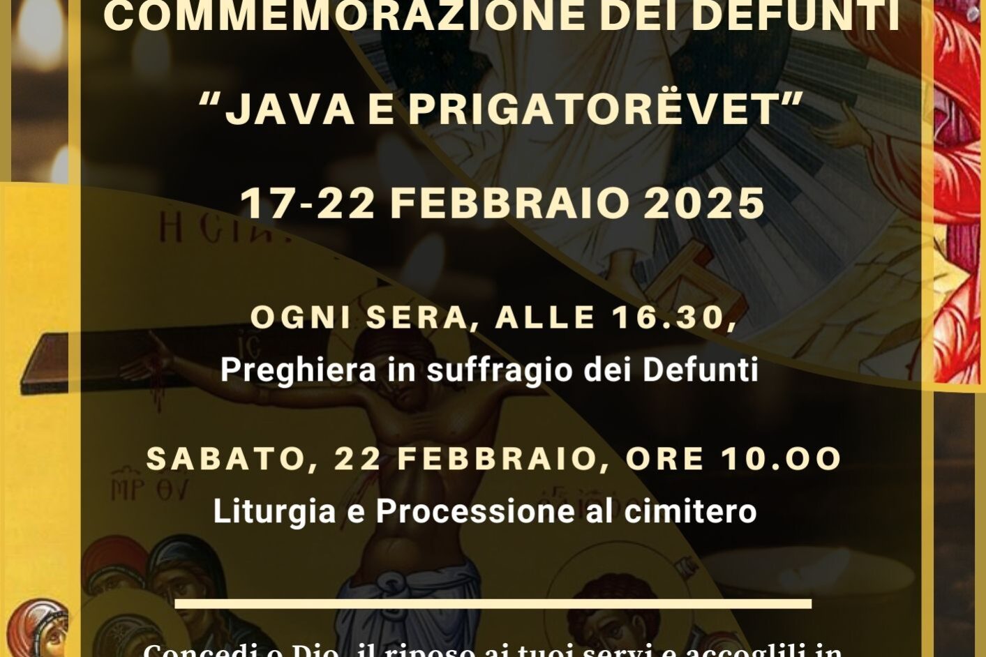 Feb142025 JAVA E PRIGATOËVET SETTIMANA DI COMMEMORAZIONE DEI DEFUNTI 17-22 FEBBRAIO 2025 Chiesa Parrocchiale San Giovanni Battista Acquaformosa (Cs) Naviga tra i postPrecedentePost precedente:GIUBILEO DELLE CHIESE ORIENTALI 12-14 MAGGIO 2025SuccessivoProssimo post:VEGLIA MISSIONARIA DIOCESANA 23 MARZO 2025More articlesVEGLIA MISSIONARIA DIOCESANA 23 MARZO 202511 Marzo 2025GIUBILEO DELLE CHIESE ORIENTALI 12-14 MAGGIO 202514 Febbraio 2025GITA AL LUNAPARK DI RENDE 10 NOVEMBRE 202430 Ottobre 2024SAGRA DELLA CASTAGNA E DEL MANGIARE ANTICO ACQUAFORMOSA 31 OTTORE E 1 NOVEMBRE 2024 MERCATINO DELL’ORATORIO PARROCCHIALE30 Ottobre 2024SAGRA DELLA CASTAGNA E DEL MANGIARE ANTICO ACQUAFORMOSA 31 OTTORE E 1 NOVEMBRE 202430 Ottobre 2024PROGRAMMA FESTA PATRONALE DECAPITAZIONE SAN GIOVANNI BATTISTA21 Agosto 2024