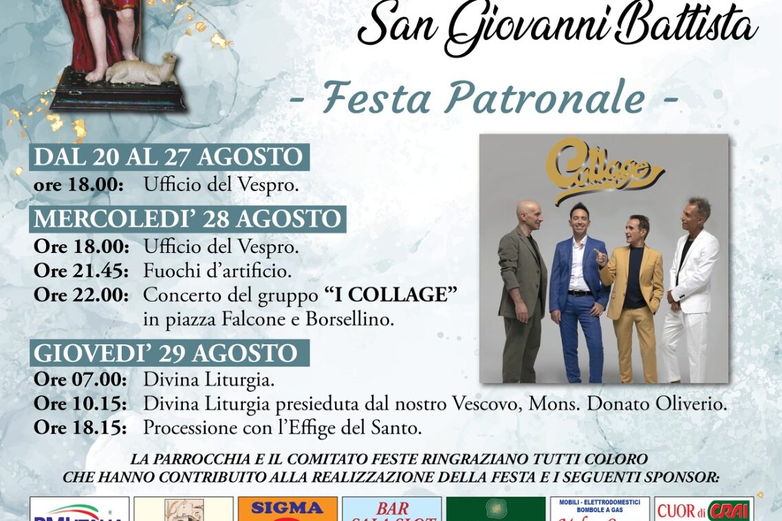 Ago212024 29 AGOSTO 2024 PROGRAMMA DECAPITAZIONE DI SAN GIOVANNI BATTISTA FESTA PATRONALE – ACQUAFORMOSA Chiesa Parrocchiale San Giovanni Battista Acquaformosa (Cs) Naviga tra i postPrecedentePost precedente:EPARCHIA DI LUNGRO AZIONE CATTOLICA DIOCESANA RITIRO SPIRITUALE DI AZIONE CATTOLICASuccessivoProssimo post:SAGRA DELLA CASTAGNA E DEL MANGIARE ANTICO ACQUAFORMOSA 31 OTTORE E 1 NOVEMBRE 2024More articlesVEGLIA MISSIONARIA DIOCESANA 23 MARZO 202511 Marzo 2025JAVA E PRIGATORËVET 17-22 FEBBRIO 202514 Febbraio 2025GIUBILEO DELLE CHIESE ORIENTALI 12-14 MAGGIO 202514 Febbraio 2025GITA AL LUNAPARK DI RENDE 10 NOVEMBRE 202430 Ottobre 2024SAGRA DELLA CASTAGNA E DEL MANGIARE ANTICO ACQUAFORMOSA 31 OTTORE E 1 NOVEMBRE 2024 MERCATINO DELL’ORATORIO PARROCCHIALE30 Ottobre 2024SAGRA DELLA CASTAGNA E DEL MANGIARE ANTICO ACQUAFORMOSA 31 OTTORE E 1 NOVEMBRE 202430 Ottobre 2024